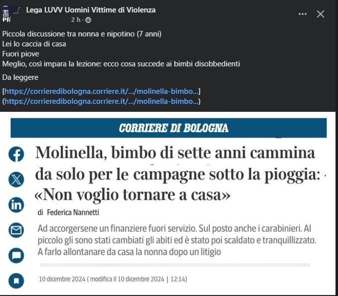Perchè vige il patriarcato … !!! Fosse stato un uomo direttamente prigione per abbandono di minore e per violenza su minore… Sicuramente arriverà qualche magistrata/giudice cogliona o collusa, incompetente, che dirà che sono state solo scaramucce …. anzi siccome il bimbo è maschio…. magari nei guai ci va il bimbo…. che di idiote che invece di pulire i gabinetti o fare le criminali come quelle della loro razza gli è venuto in mente di “studiare” legge… studiare per modo di dire… (con bustarelle, raccomandazioni di criminali e mafiosi, con truffe, e aprendo le cosce…. io diventerei neurochirurgo) |